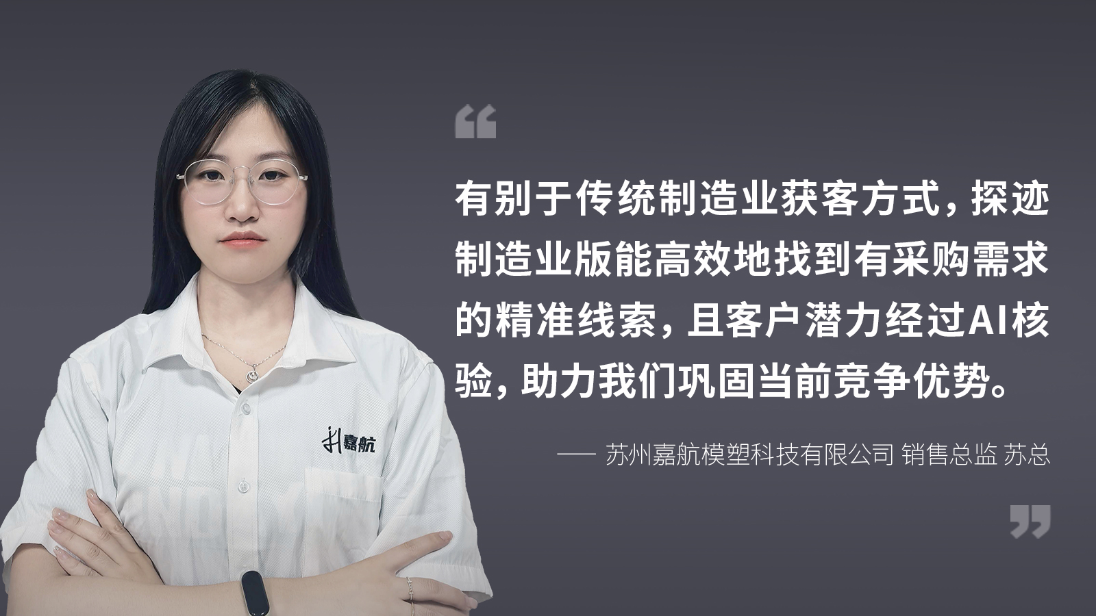 嘉航模塑位于昆山生产车间里,弥漫着依旧熟悉的塑料热熔气味与机器轰鸣声,销售总监苏总上班第一件事照例是下车间巡视,一年前萦绕在她心头的焦虑与迷茫,如今已被一种笃定所取代。那时,她刚刚被推上销售负责人的位置,面对的是一个亟待转型的传统工厂,“客户到底在哪里?”“如何高效触达真正需要的人?”“有限的资源应投向何方?”这些问题像巨石一样压在她心上。作为从文员岗位晋升、几乎“零销售经验”的新手总监,苏总深知,嘉航需要一场彻底的销售端AI变革,而她也必须在这场变革中快速学习破局。一年以后,在AI融入销售端后,嘉航模塑增长超过30%,在激烈市场竞争中开辟第二增长曲线。