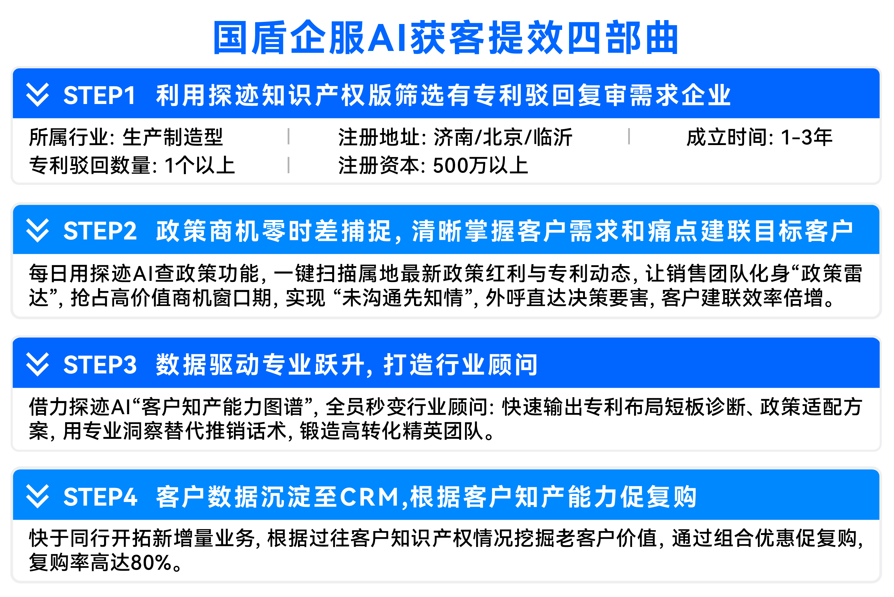 探迹AI成了国盾企服的精密获客导航仪。杜总兴奋地分享,“以前我们主要找制造业、科技的企业,很笼统、很低效。现在探迹AI几秒钟就可以让我们精确定位想要开发的客群,像高企新办、专利转让、专利驳回复审等业务客群都帮我们梳理出来了!” 通过探迹,他们将销售团队按行业、按业务类型、按地区精细分工,真正实现了有的放矢。