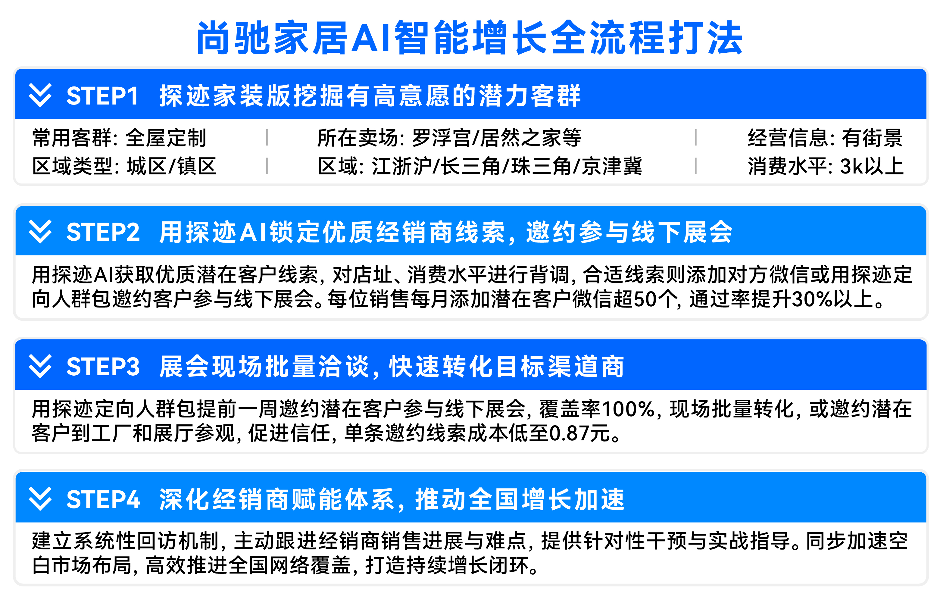尚驰家居在过去16年的时间里,通过搭建生产、销售的供应链体系,进一步巩固自身的竞争优势。作为中国航天事业合作伙伴和国家高新技术企业,尚驰家居很早就将研发重点集中在睡眠科技上,其自主研发的AI睡眠系统能够根据人体压力点分布实时调整床垫支撑,实现“一张床垫,两种体验”。受房地产市场下行影响,家居行业经营压力加剧,众多企业开始收缩战线。在此背景下,尚驰家居积极寻求销售环节的突破,力图变革传统招商模式,以AI技术驱动营销全流程提质增效。2021年尚驰家居携手探迹AI开展合作至今,传统模式下难以触及的优质经销商与空白市场,在AI的透视下变得清晰可触。