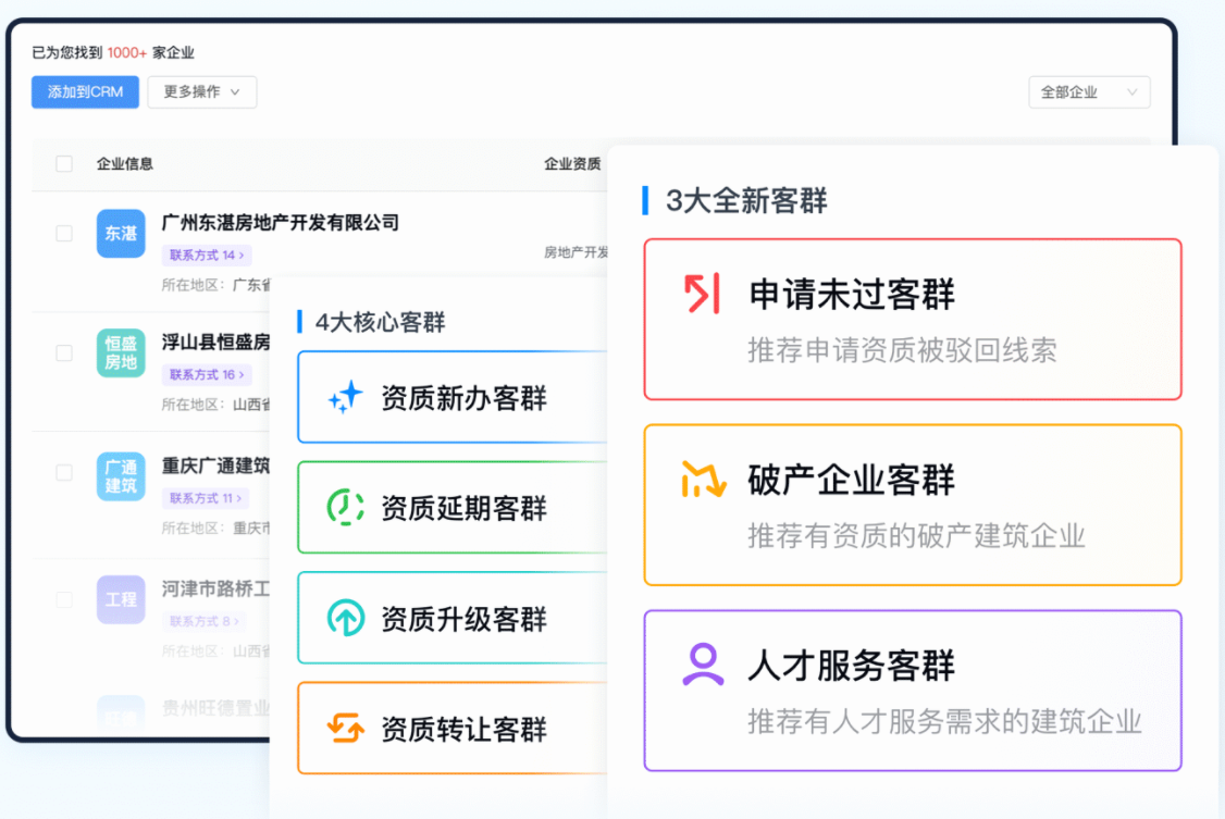 平台基于对行业的深度洞察,精准构建了“资质新办、资质延期、资质升级、资质转让、申请未过、人才服务、破产企业”七大核心客群模型。这直接对应了建筑企业资质管理的全生命周期需求点。