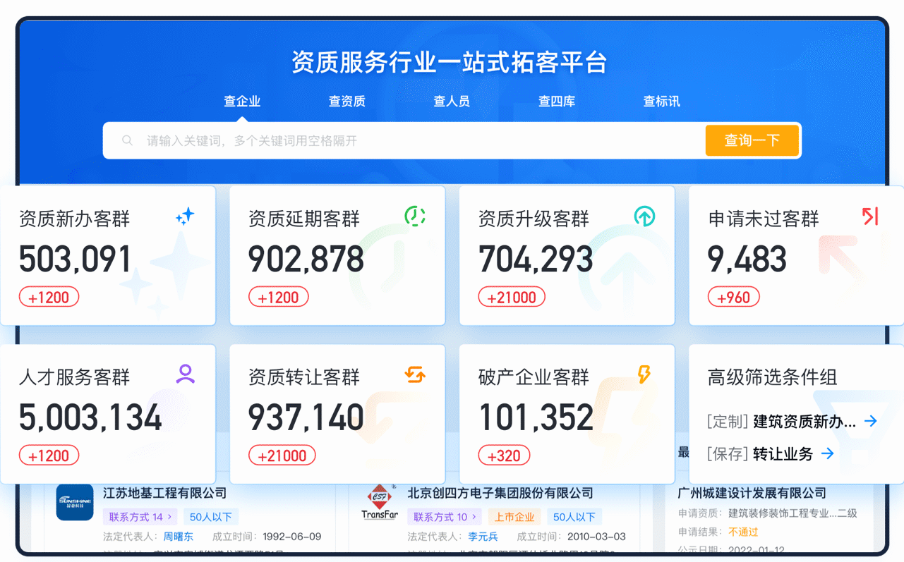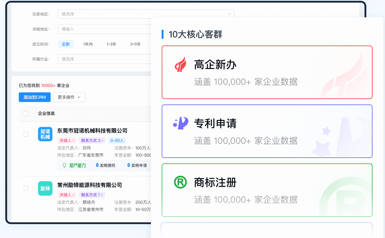 • 再结合“成立时间≤5 年”“注册资本≥1000 万”“专利/软著≥10 件”等条件,快速缩小到高潜客户;