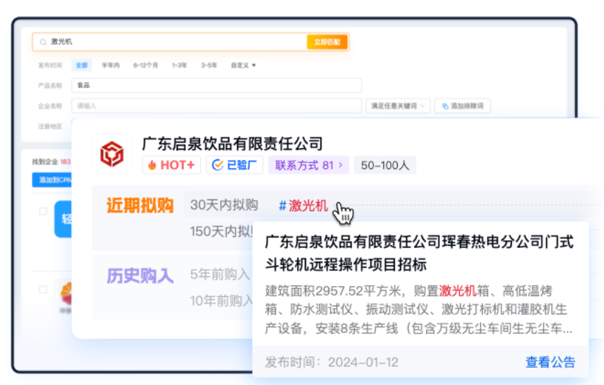 3. 数据平台辅助筛选:在探迹拓客机械设备版中,一键获取全国范围内具有采购意向的纸杯生产企业,平台汇聚了337万+拟建 项目 公告和14万+机械设备品类信息,帮助您快速定位核心客户。