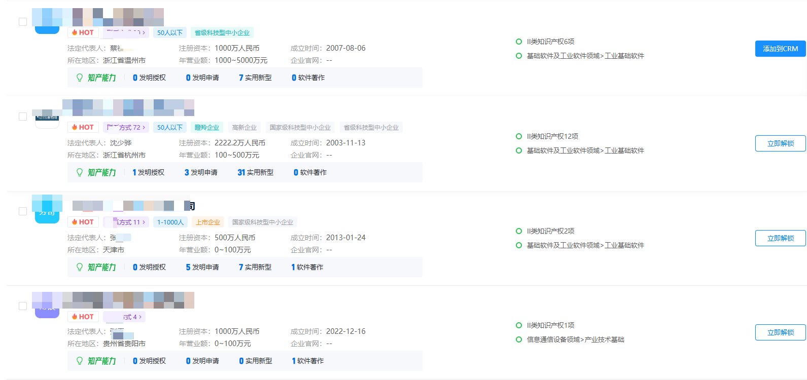 在筛选出来的企业名单中可以直接了解该企业的知产能力、注册资本、时间、营业额、公司人数,以及改企业的属性标签,例如省级科技型中小企业。