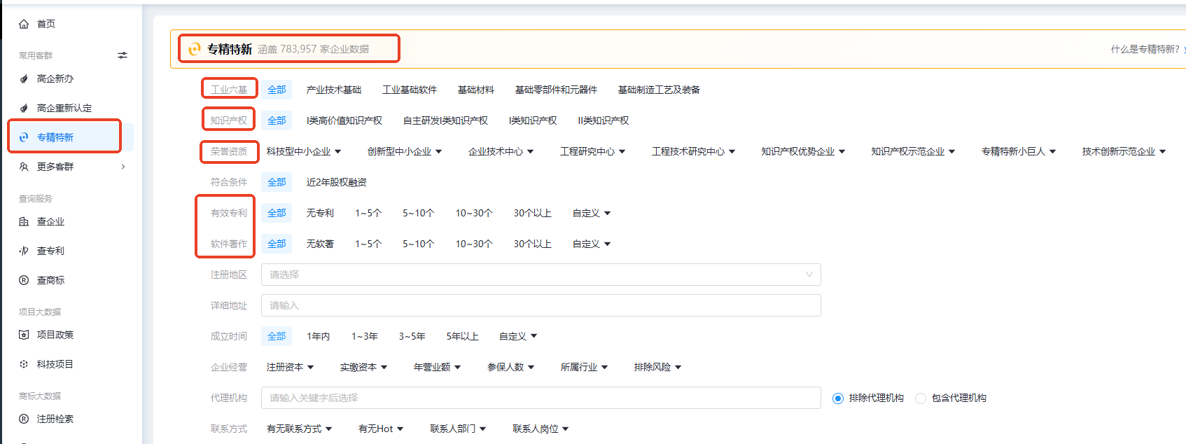 在探迹拓客知产版里面可以根据客群类型-专精特新,一键查询78w+的专精特新企业名单,还可以工业六基、知识产权、荣誉资质、有效专利个数、软件著作等筛选条件进一步筛选出自己的目标客户,让客户群体更加细分和准确。