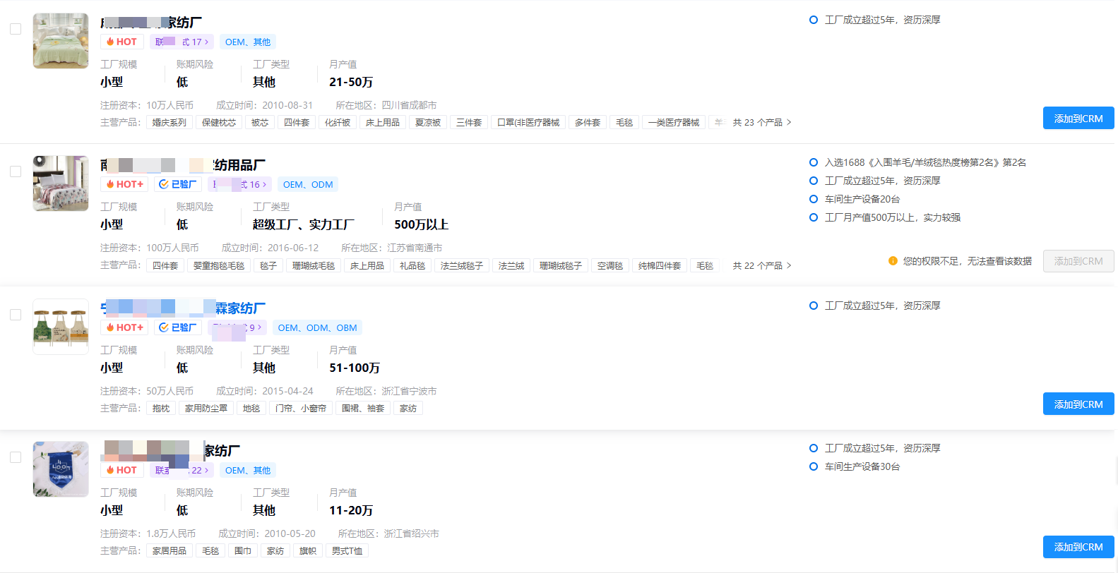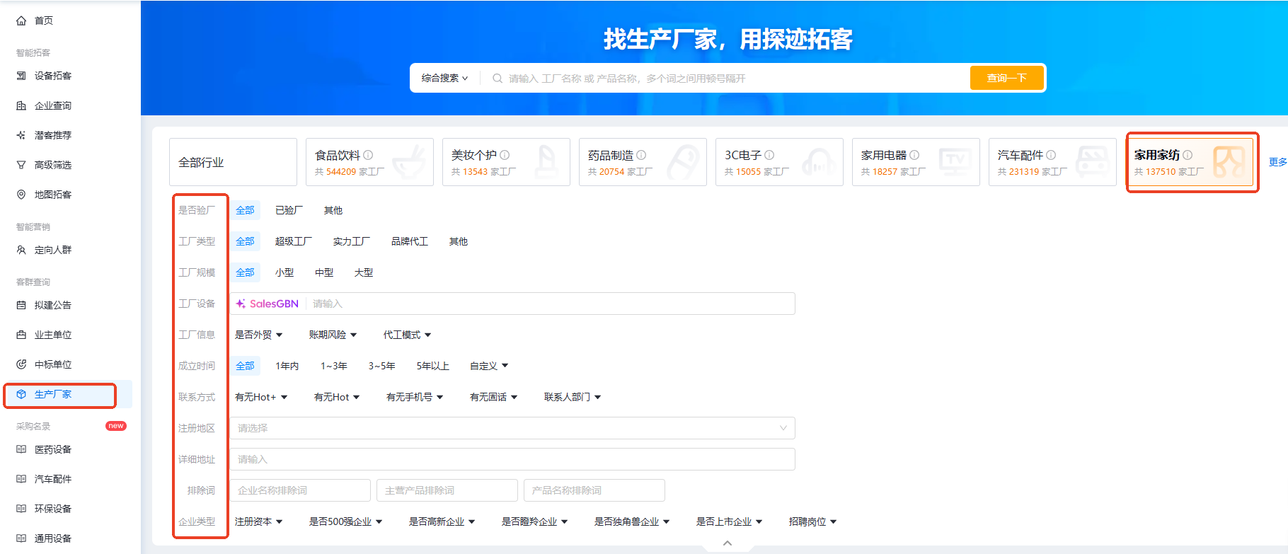 可以在探迹拓客机械设备版上面按照生产厂家客群-选择家用家纺行业,可以一键查询13w+的纺织厂企业信息。