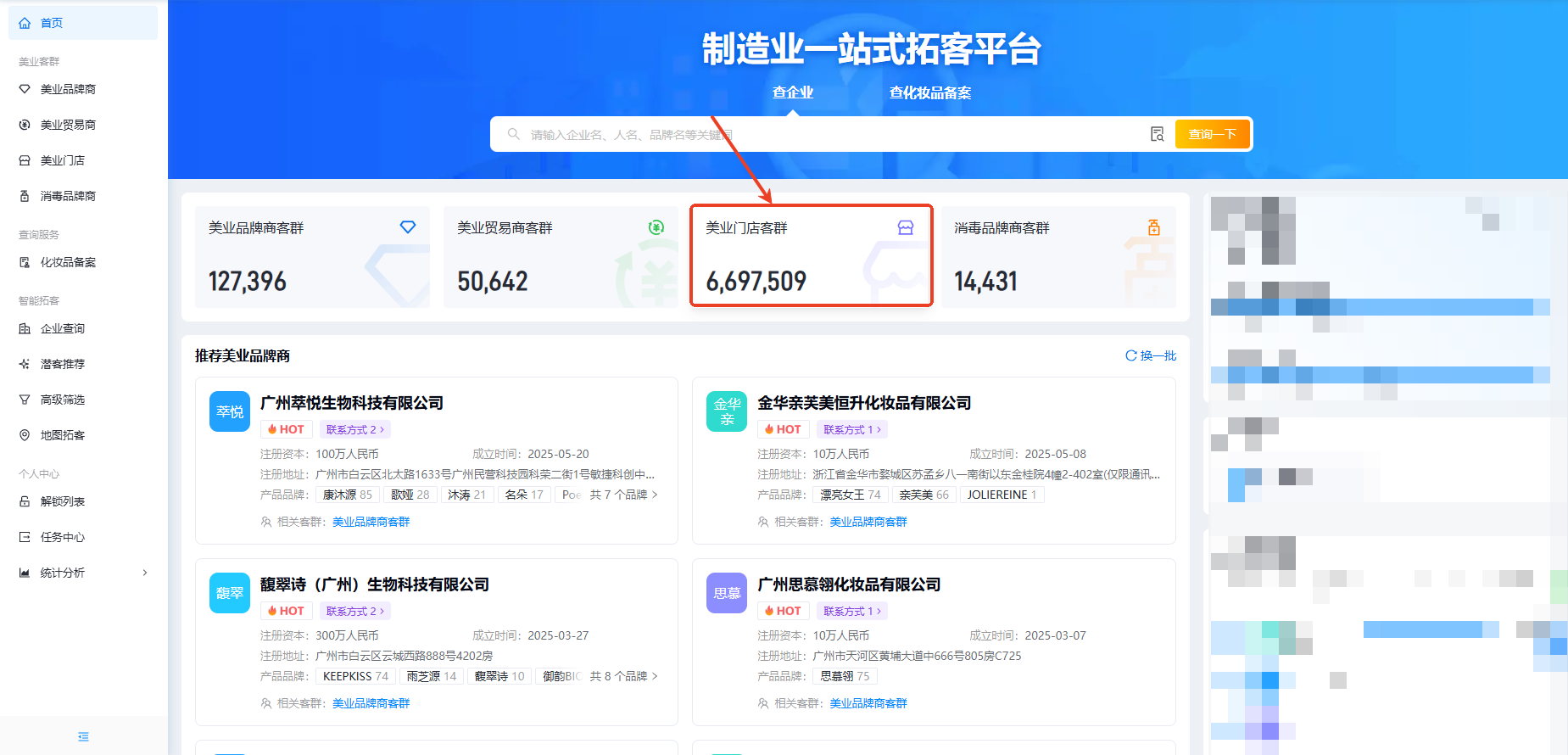 在探迹拓客美业版首页选择“美业门店”客群,即可查询超600w的美业门店客群资讯