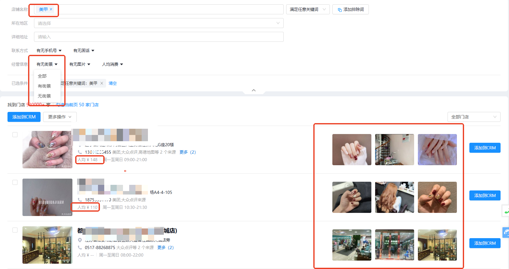 在系统内置的筛选条件可以直接输入“连锁美甲”,即可批量查询连锁美甲店客群(连锁美甲店的品牌名、门店名),还可以通过选择“有无街景”查看美甲店的附近街景,判断其门店布局和门店的流量情况以及人均消费情况。