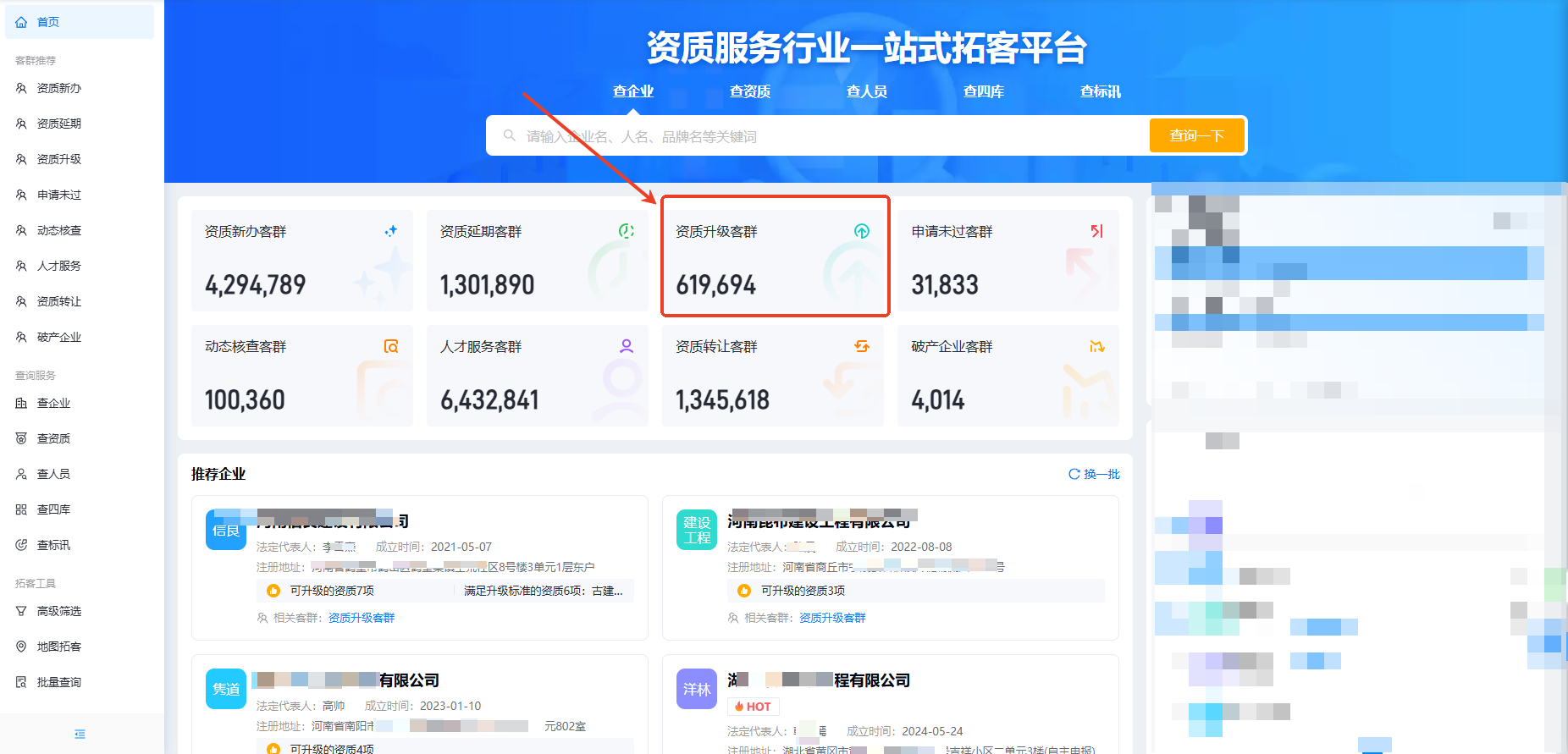 例如查询公路机电一级资质名单,可以在平台选择“资质升级”客群,这里汇聚了超60w的有资质升级的企业信息,而且企业数据还会不断进行更新。