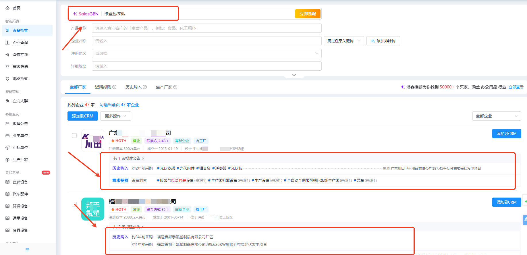 例如想要精准找到有采购机械设备需求的纸盒包装厂,可以直接在探迹拓客的SaleGBN直接搜索“纸盒包装机”,系统会立马找出有纸盒包装机采购需求的厂商,还可以直接看到厂家的历史采购记录。